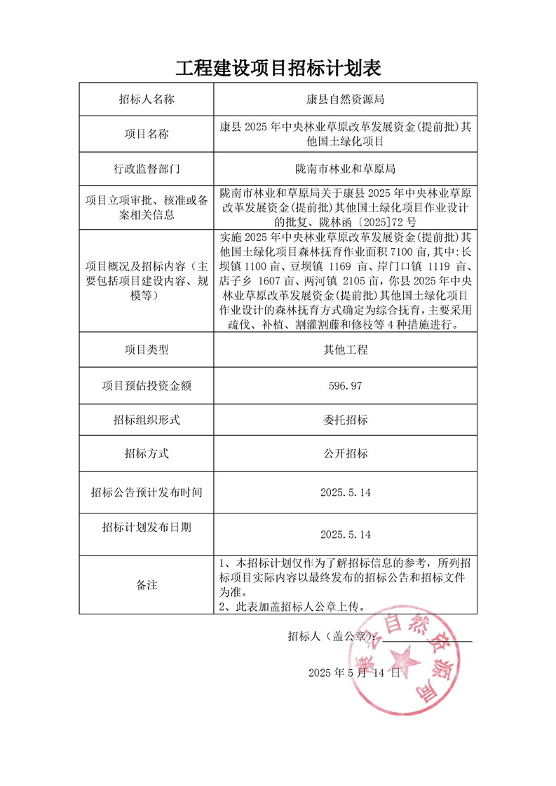 康縣2025年中央林業(yè)草原改革發(fā)展資金(提前批)其他國土綠化項目