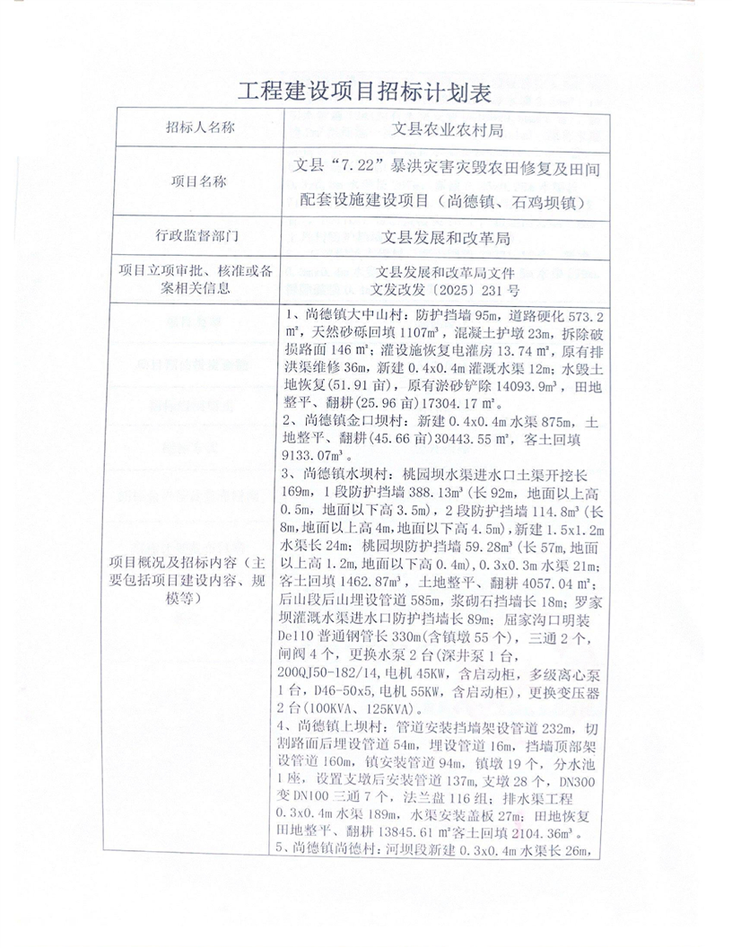 文縣“7.22”暴洪災(zāi)害災(zāi)毀農(nóng)田修復(fù)及田間配套設(shè)施建設(shè)項(xiàng)目(尚德鎮(zhèn)、石雞壩鎮(zhèn))