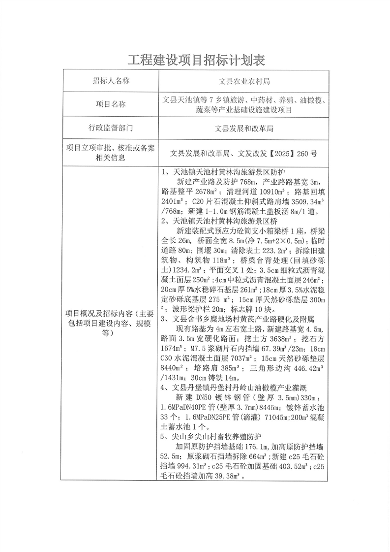 文縣天池鎮(zhèn)等7鄉(xiāng)鎮(zhèn)旅游、中藥材、養(yǎng)殖、油橄欖、蔬菜等產(chǎn)業(yè)基礎設施建設項目