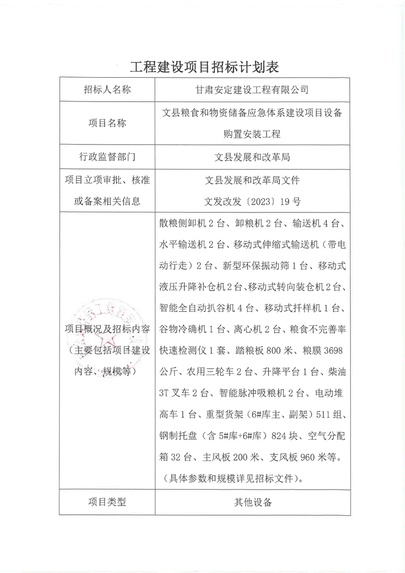 文縣糧食和物資儲備應(yīng)急體系建設(shè)項(xiàng)目設(shè)備購置安裝工程