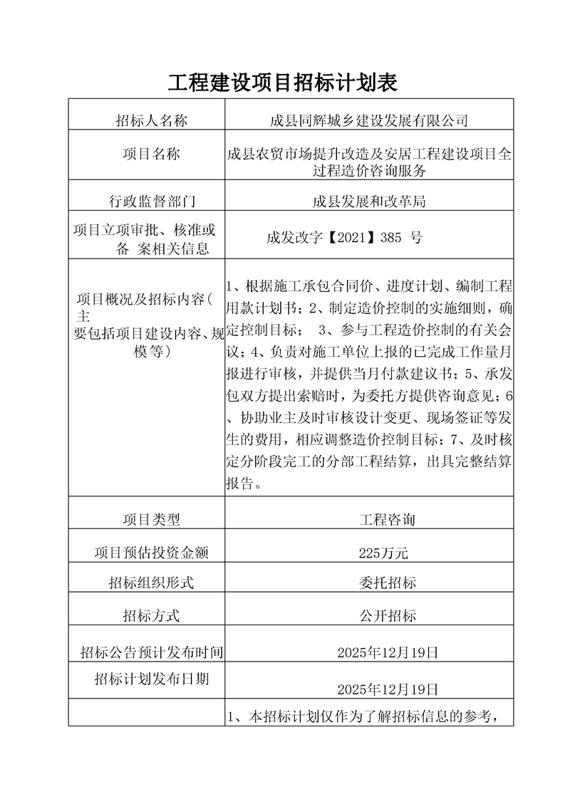 成縣農(nóng)貿(mào)市場提升改造及安居工程建設(shè)項目(一期)全過程造價咨詢服務(wù)