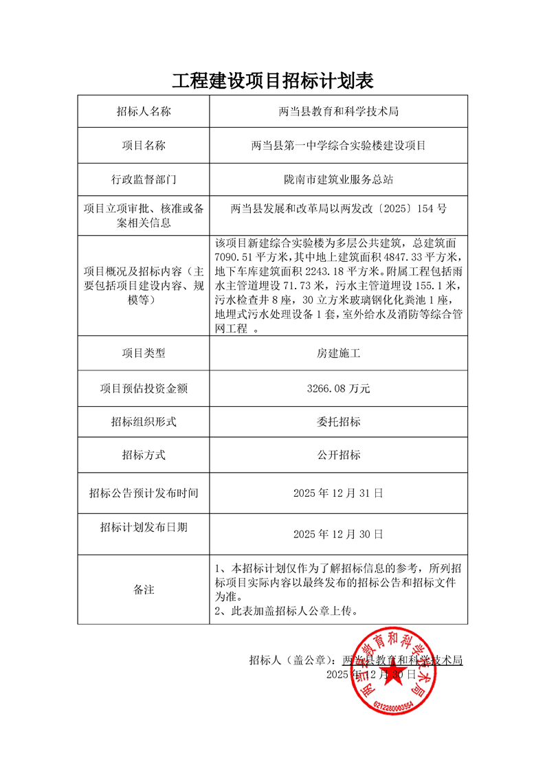 兩當(dāng)縣第一中學(xué)綜合實驗樓建設(shè)項目
