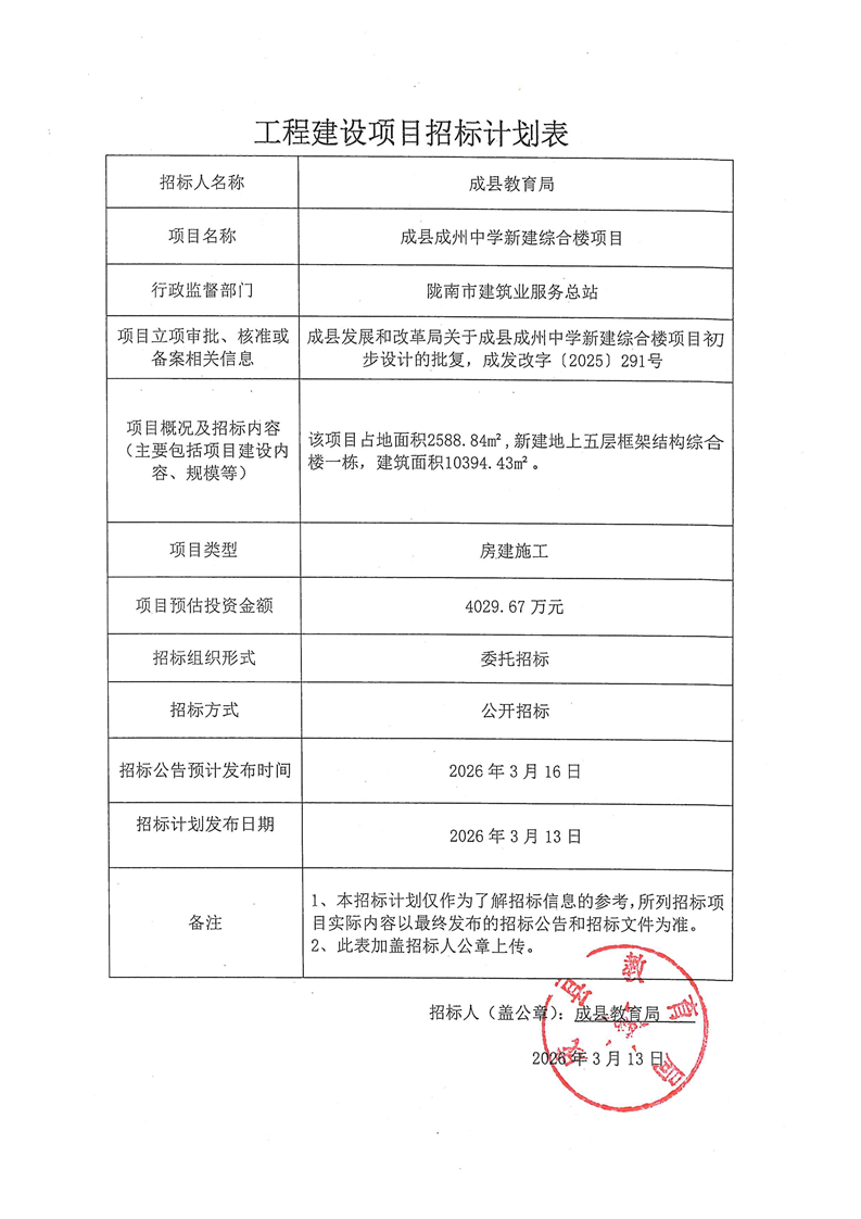 成縣成州中學(xué)新建綜合樓項(xiàng)目