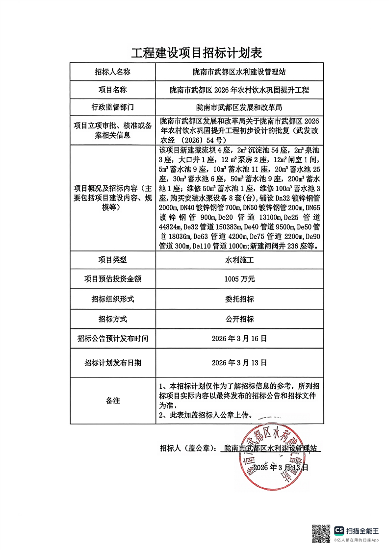 隴南市武都區(qū)2026年農(nóng)村飲水鞏固提升工程